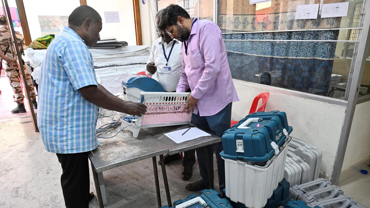 Officials inserting the Ballat papers(candidate names and symbol) to EVMs and check with VVPAT for the Vellore Assembly Constituency on April 16, 2026.