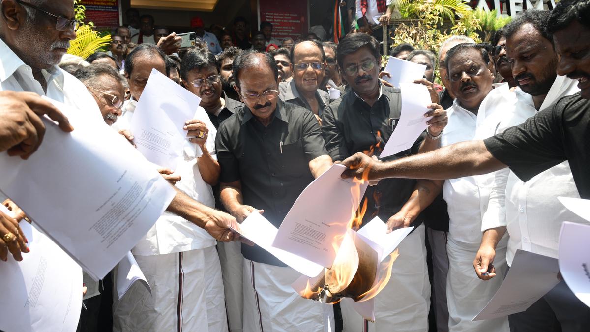 DMK cadre and Minister for Tourism R. Rajendran burning a copy of the Delimitation Bill and staging a protest in Salem on Thursday.