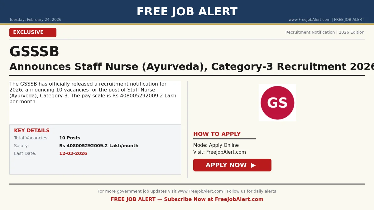 Gujarat Subordinate Service Selection Board (GSSSB) has released an official notification for the recruitment of 10 Staff Nurse (Ayurveda) Posts. Interested and eligible candidates can apply Online through the official GSSSB website. The last date to submit the application form is 12-03-2026.