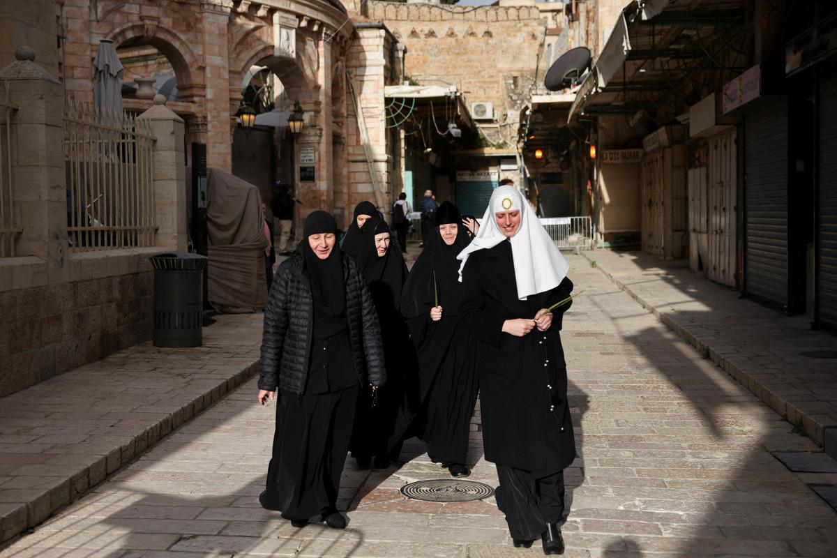 Christian worshippers are seen walking on a street, following restrictions on gatherings in large groups, amid the U.S.-Israel conflict with Iran, in Jerusalem’s Old City on April 5, 2026.