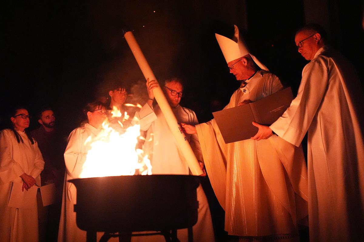 Archbishop Paul D. Etienne, second from right, prepares to light the Paschal candle as worshippers attend an Easter vigil at St. James Cathedral on April 4, 2026, in Seattle.