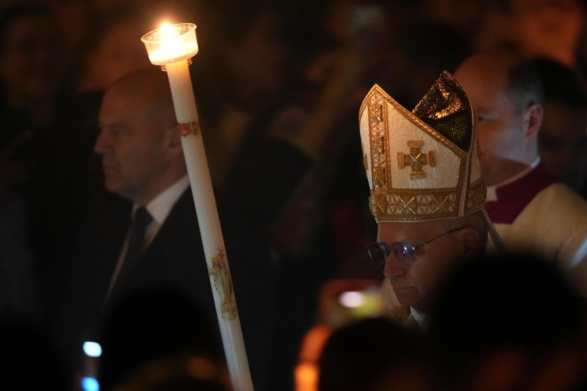 Worshippers hold candles during the Easter vigil Mass in the Cathedral Basilica of Vilnius, Lithuania, late on April 4, 2026.