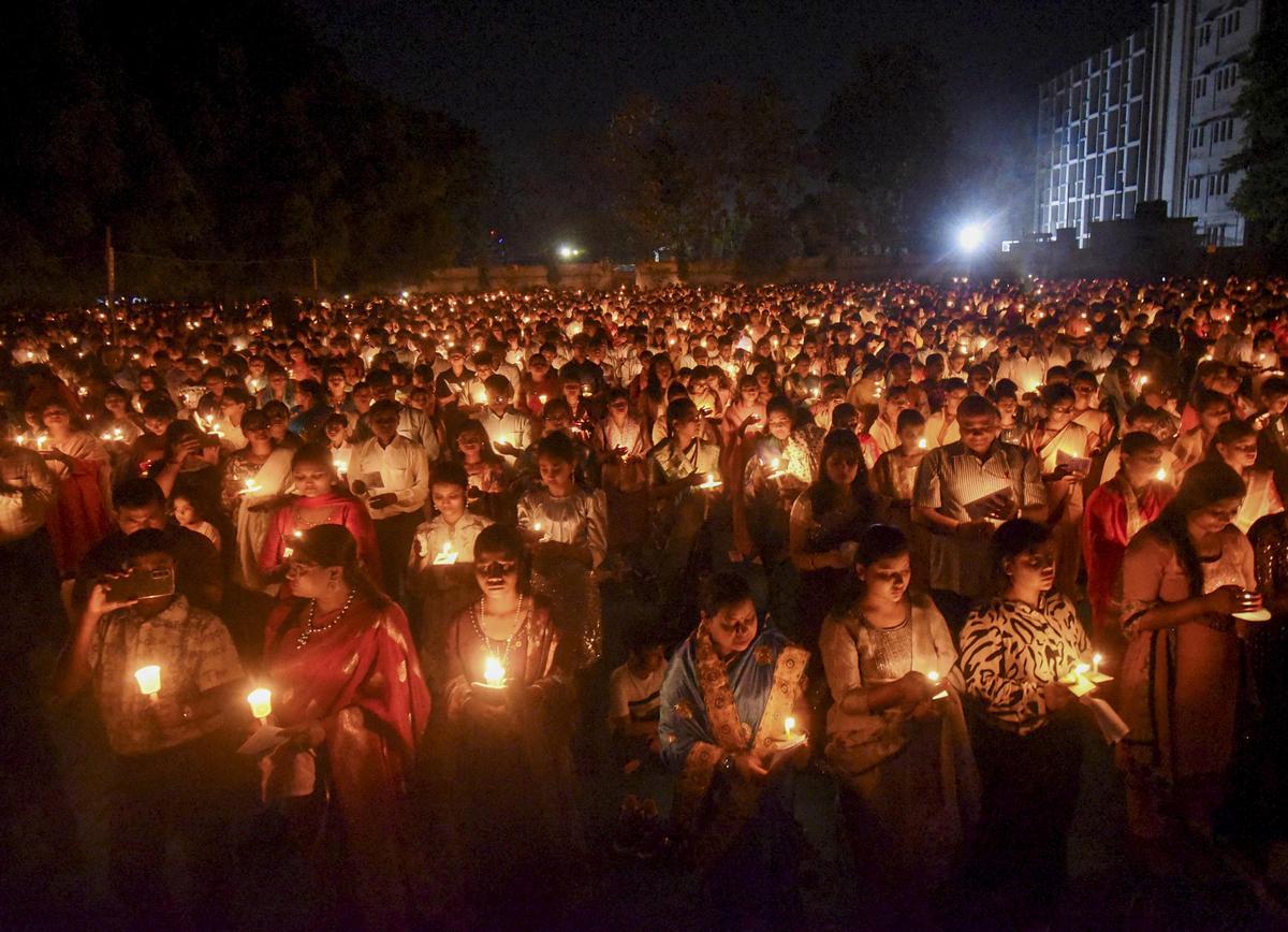 Devotees are seen lighting candles as they take part in mass prayer on Easter, at The Queen of the Apostles’ Church, in Patna, Bihar, late on April 4, 2026.